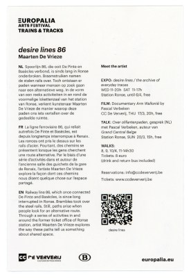 Tijdens Europalia Festival Trains & Tracks onderzoekt Maarten zijn project desire lines vertrekkend vanuit terminus Ronse, spoorlijn 86 die ooit De Pinte en Basècles verbond, houdt er vandaag op. Al zijn de stalen rails verdwenen, er zijn mensen die zich de verlaten spoorlijn eigen maken. Sommige paden zijn ontstaan vanuit een verlangen naar een alternatieve weg in het dagdagelijks leven, andere zijn onderdeel van een groter netwerk of vervullen diverse activiteiten. Spoorlijn 86 ligt er reeds lang onderbroken bij, waardoor deze alternatieve paden doorheen de tijd van elkaar afgesneden zijn door ondoordringbare braamstruiken. Toch heeft elk pad een gemeenschappelijk verleden dat als een lijn doorheen het landschap zijn sporen achterlaat.